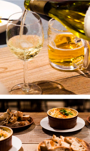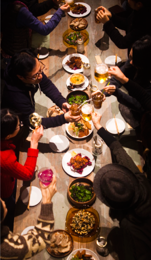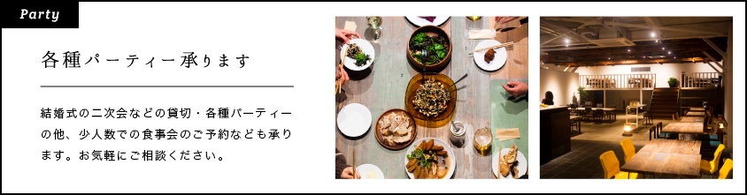 地ビールや地酒をたのしみながらにぎやかに。大きなテーブルで一つの家族のように食事ができるのもチャウスの魅力のひとつです。